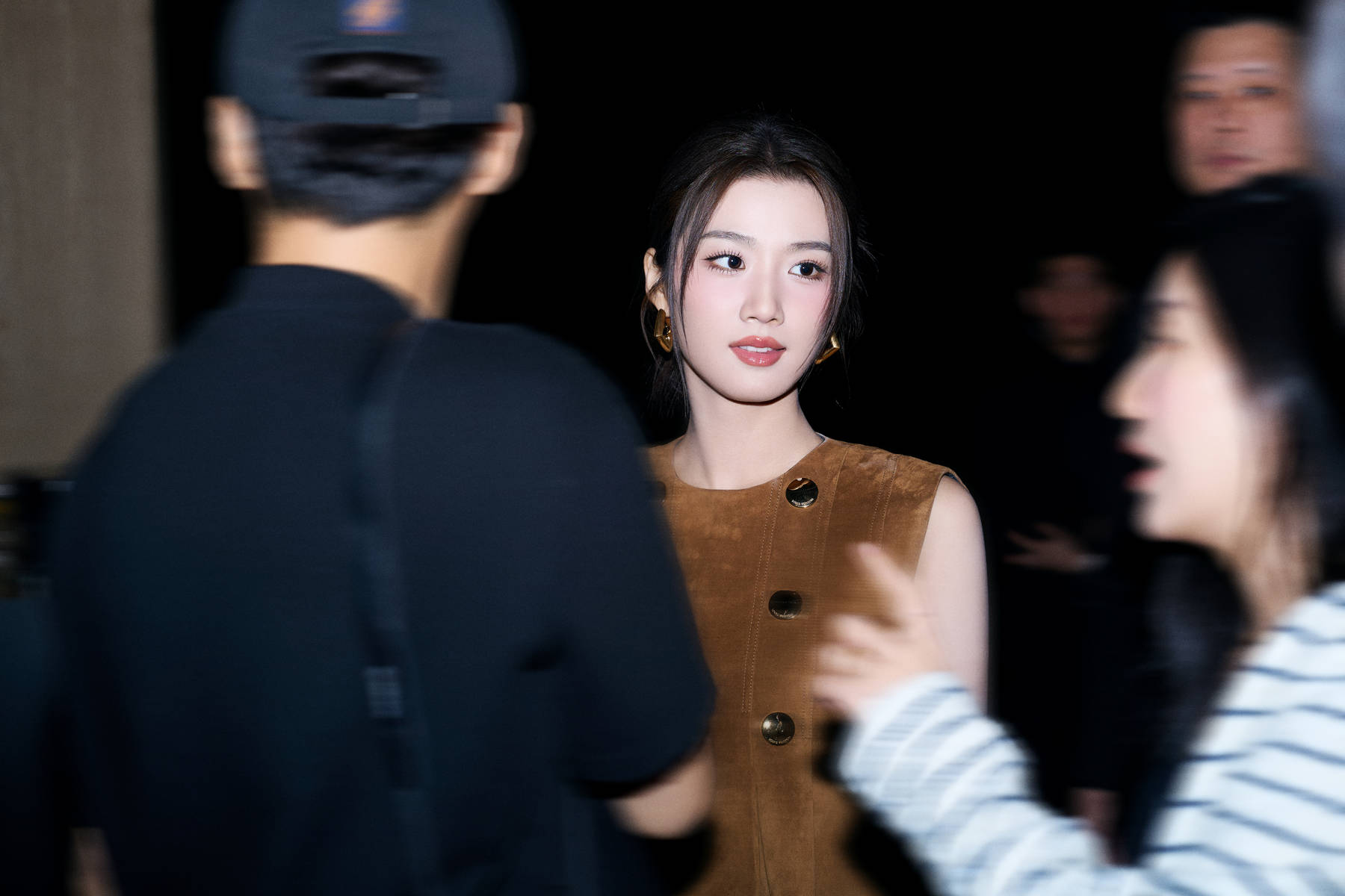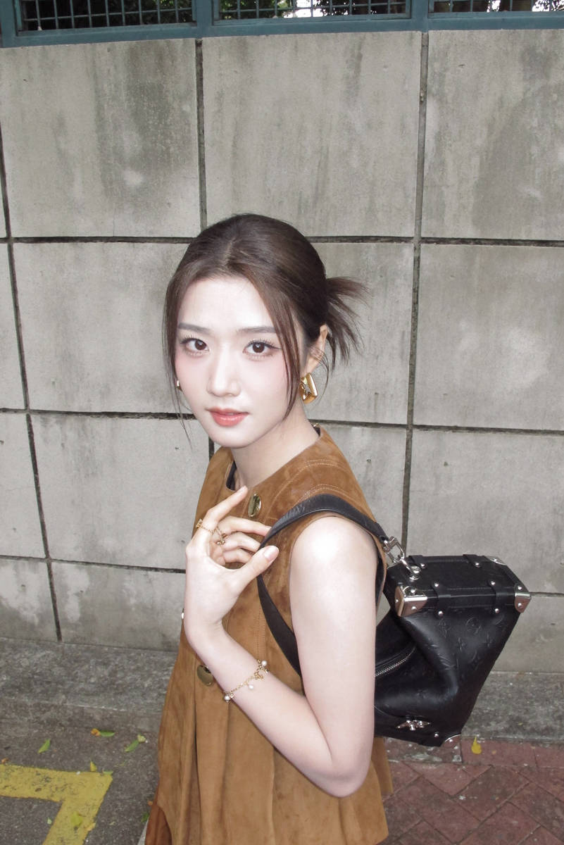与服装相得益彰的,是卢昱晓的经典盘发造型。将乌黑的长发精心盘起,露出光洁饱满的额头与纤细的脖颈,让肩颈线条的美感得以完整展现。盘发并非刻板的规整样式,而是在发顶保留了些许碎发,鬓角处也留出几缕发丝自然垂落,微风拂过时轻轻飘动,为整体造型增添了几分随性慵懒的气质。清丽的眉眼在简约妆容的修饰下更显灵动,浅杏色的唇釉与焦糖棕的裙装形成和谐搭配,既提升了气色,又不显得张扬,完美诠释了“清丽脱俗”的真谛。