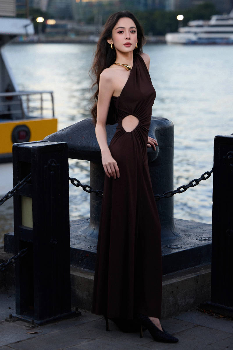 礼裙的设计堪称“细节见真章”,每一处巧思都精准戳中时尚审美。经典的单肩版型打破了对称设计的沉闷,仅以一侧精致的肩带承载裙身,自然勾勒出流畅的肩颈线条,锁骨的优美弧度清晰可见,增添了几分慵懒随性的高级感。与单肩设计相呼应的是裙身侧面的镂空元素,并非夸张的大面积剪裁,而是以精致的几何纹路勾勒出恰到好处的露肤度,既展现了腰部的纤细曲线,又通过面料的叠合营造出层次分明的视觉效果,避免了性感元素的低俗化表达。