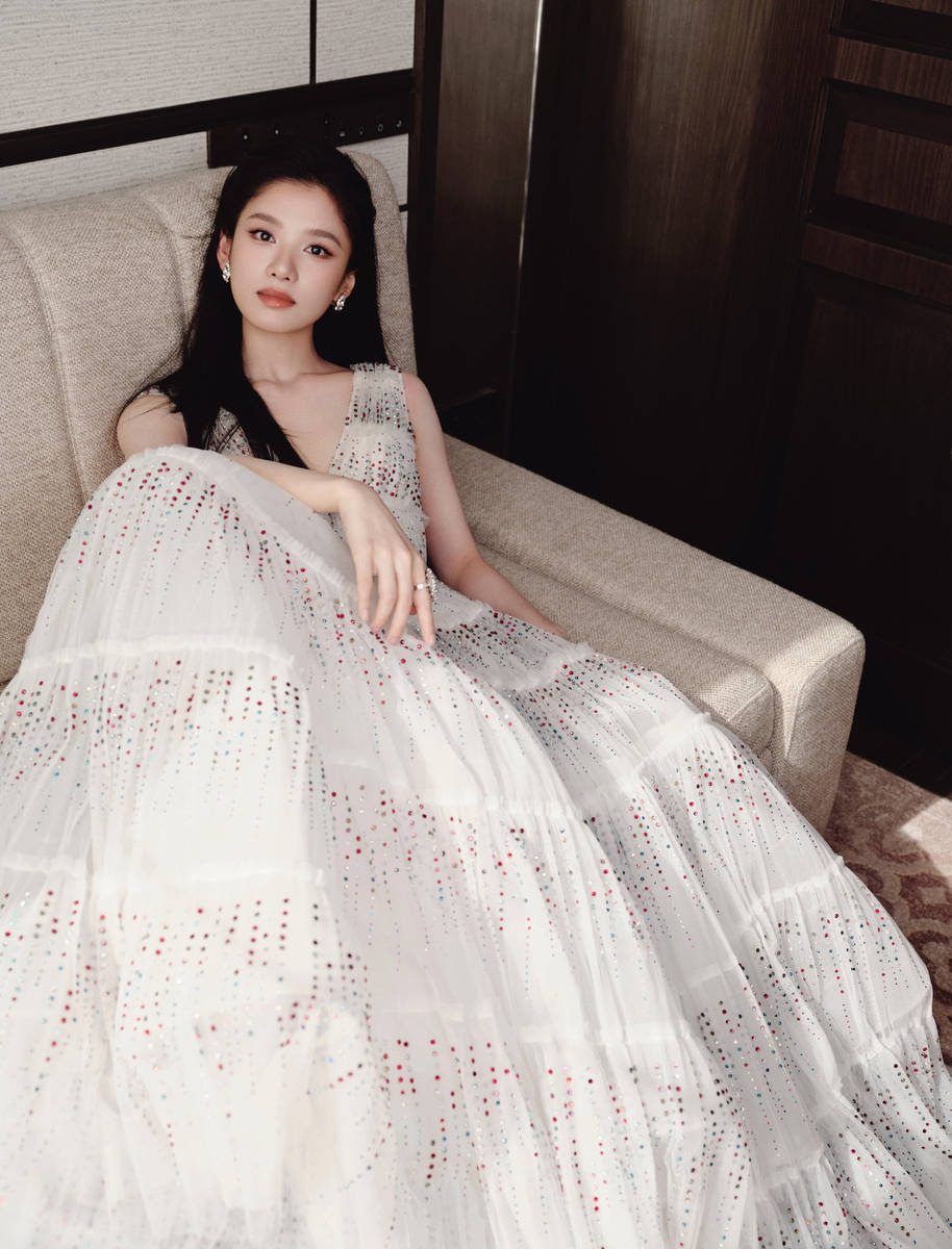 造型背后藏着的审美巧思更值得细品。这款白色纱裙摒弃了当下流行的繁复装饰,仅在裙身点缀了细碎的水晶刺绣,走动时随着肢体摆动折射出细碎的光芒,如同夜空中散落的星子。搭配的裸色高跟鞋没有明显的logo标识,却以流畅的线条呼应着纱裙的简约风格,整体造型从色彩到剪裁都形成了完美的闭环。这种“少即是多”的穿搭理念,恰好契合了张婧仪近年来的职业调性——不追求流量噱头,专注于作品本身。